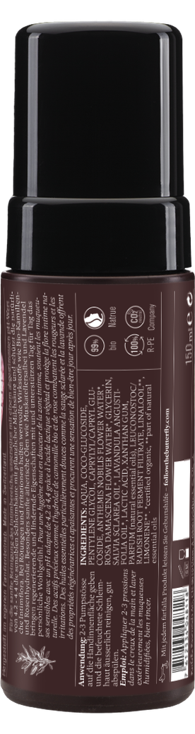 Für die sanfte Reinigung des Intimbereichs, unterstützt mit einem abgestimmten pH-Wert von 4.2 - 4.4 die sensiblen Schleimhäute mit pflanzlicher Milchsäure und schützt die natürliche Intimflora. Bei Rötungen und Irritationen helfen wertvolle Wirkstoffe wie Bio-Kamillen- und Rosenhydrolat. Besonders sanfte ätherische Ölen wie Muskatellersalbei und Lavendel bringen regenerierende und lindernde Eigenschaften mit und unterstützen Tag für Tag das persönliche Wohlgefühl.