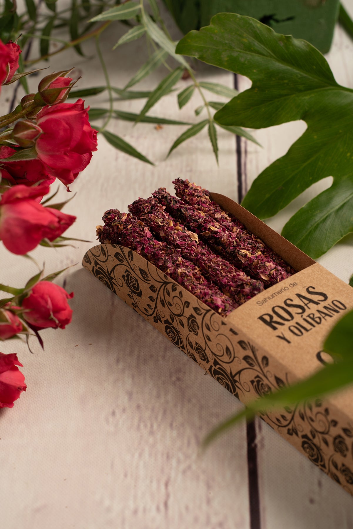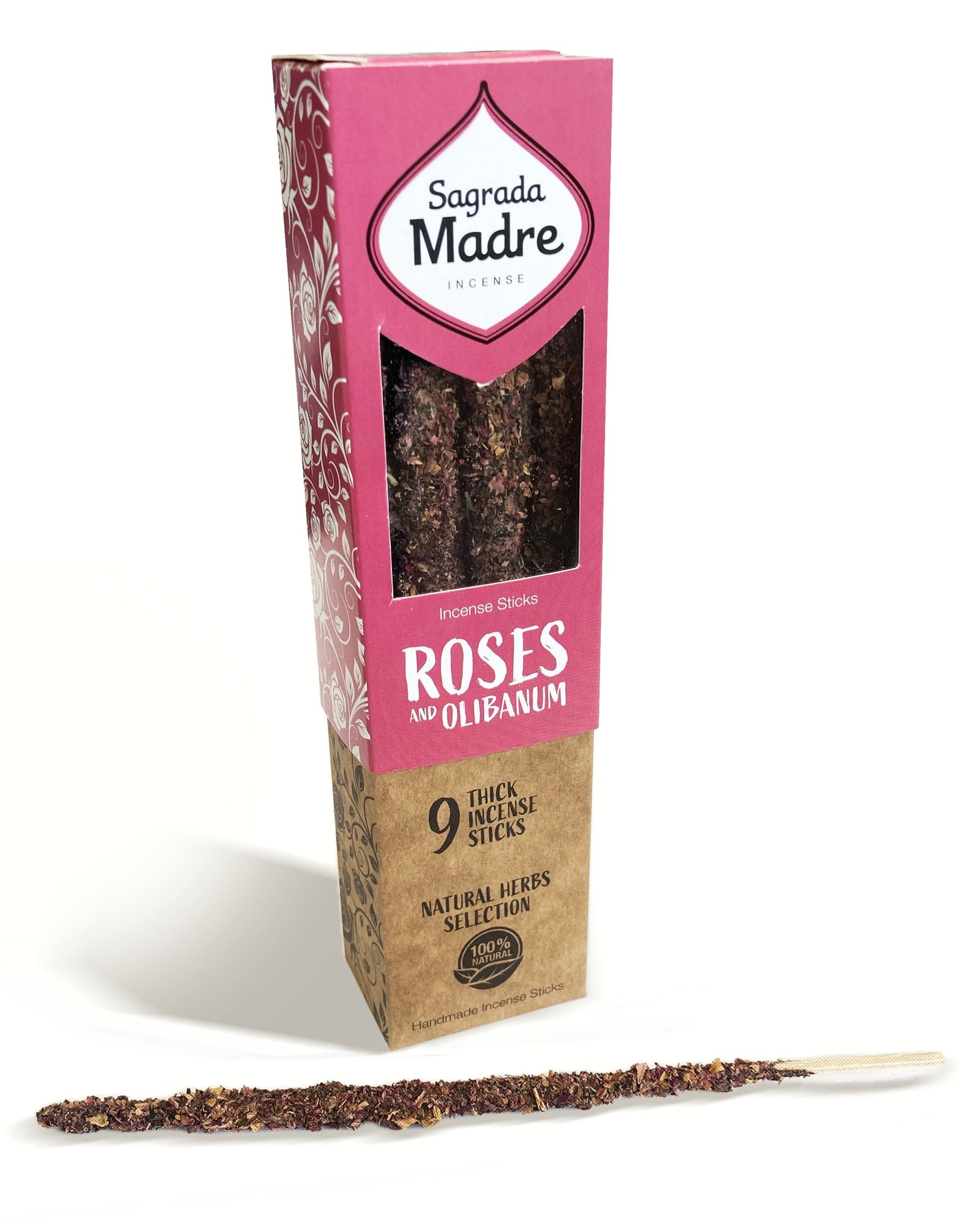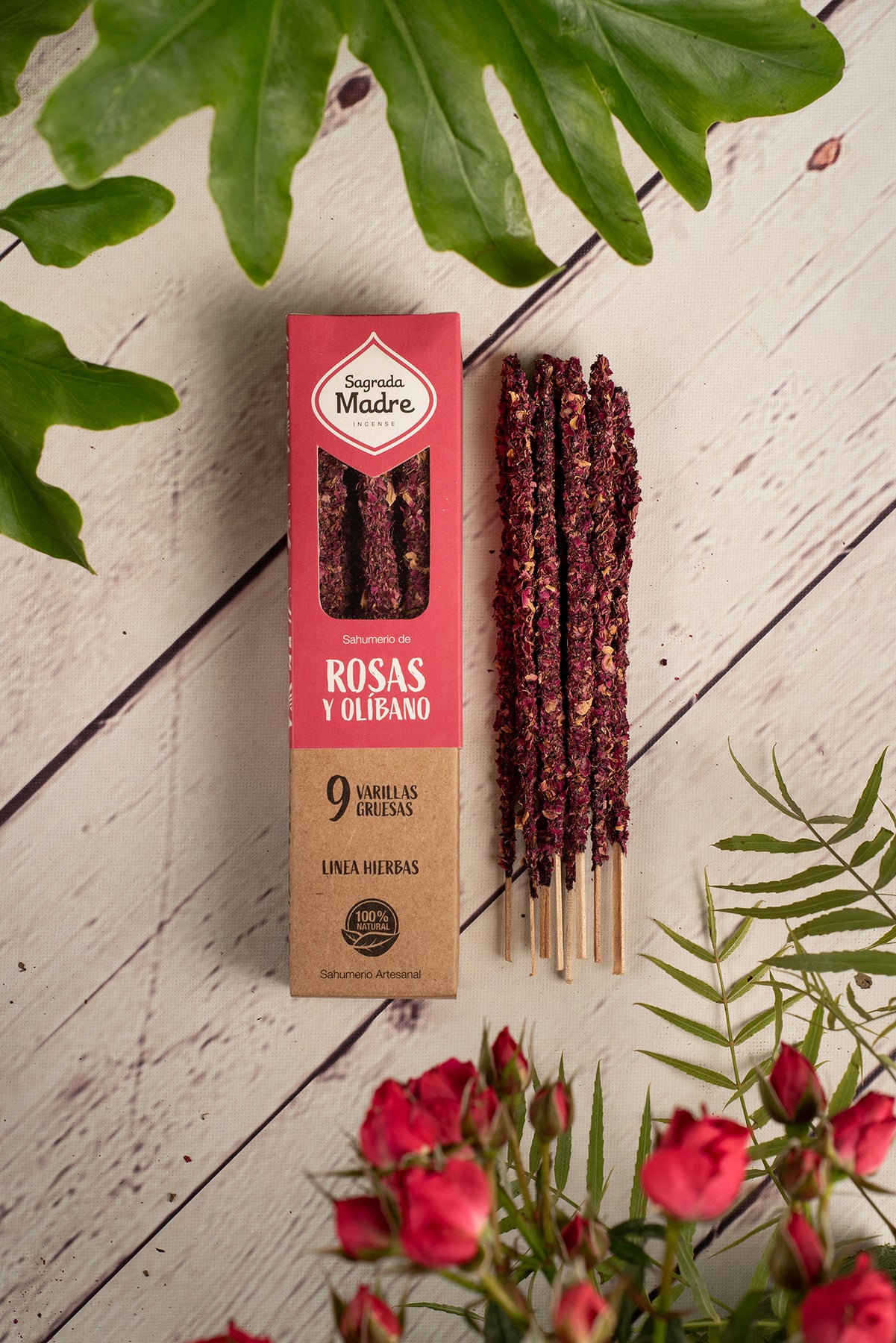 Räucherstäbchen aus natürlichen Kräutern, aus der Sagrada Madre Familie. Es ist ein vollständig organischer Weihrauch, der aus vollständig natürlichen und ökologischen Kräutern und Harzen besteht und einen kraftvollen Duft von Rose und Olibanum trägt.