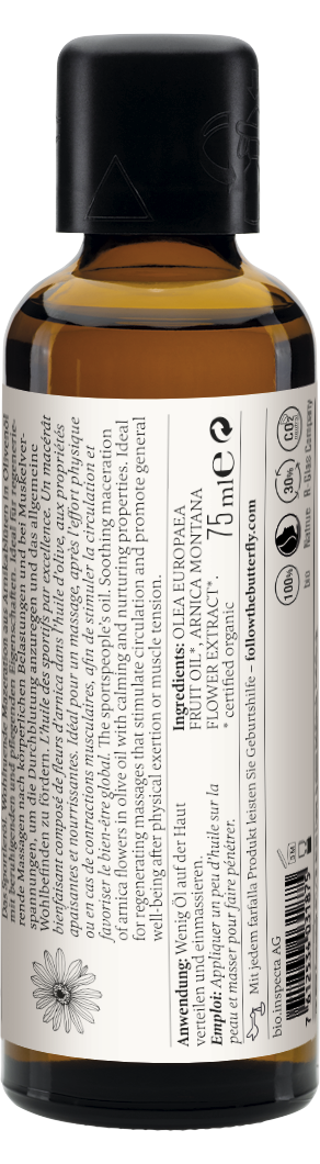 Inhaltsstoffe: OLEA EUROPAEA FRUIT OIL*, ARNICA MONTANA FLOWER EXTRACT*. * certified organic.
