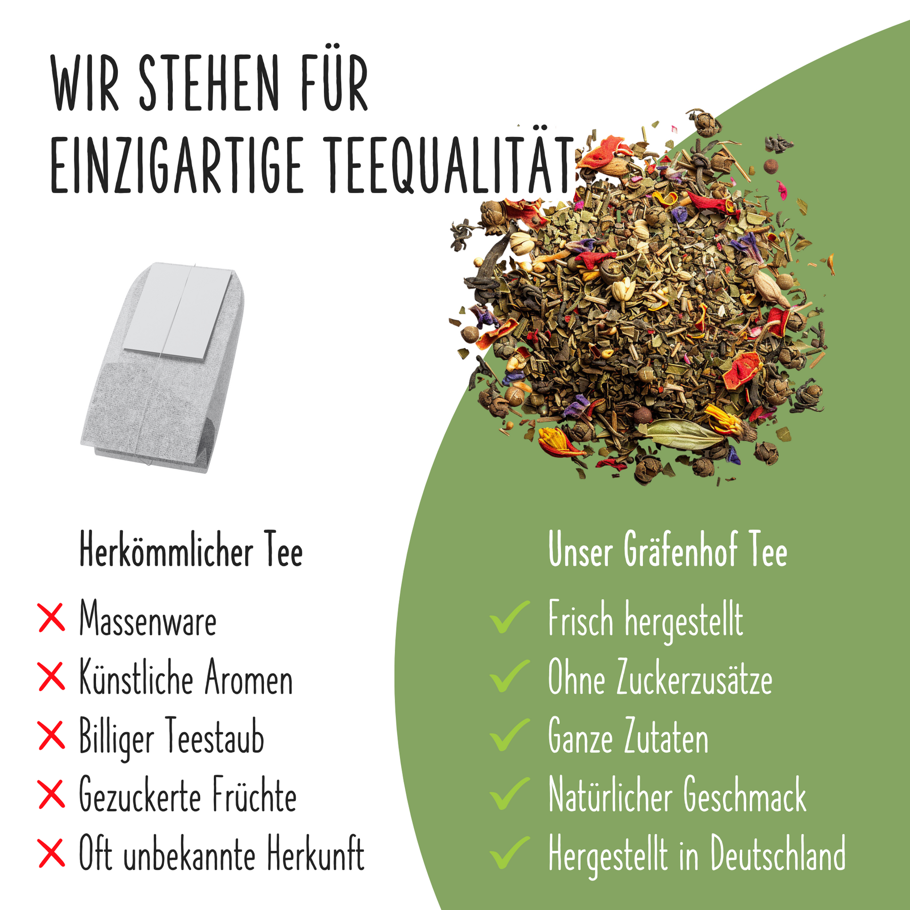 Der BIO Grüner Apfel Minze Tee bietet ein erfrischendes Geschmackserlebnis. Die fruchtige Süße des grünen Apfels harmoniert perfekt mit der belebenden Frische der Minze. Gleichzeitig bringt der Tee viele gesundheitliche Vorteile mit sich. Leider sind wir als Hersteller sehr eingeschränkt, was die gesundheitlichen Aussagen betreffen. Aus diesem Grund findest du oft sehr wenige Informationen über Wirkungen und Benefits unserer Produkte.
