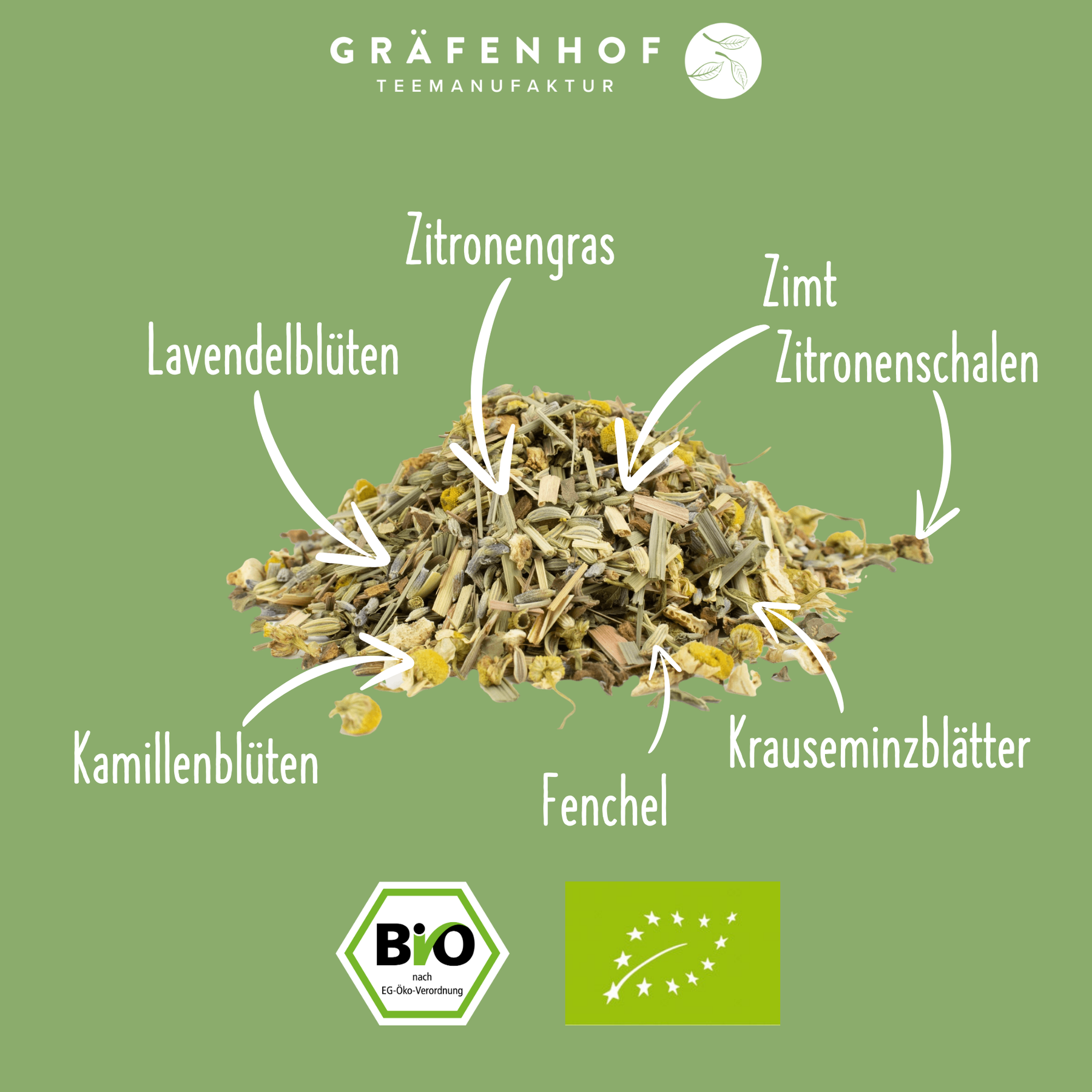 Der Gräfenhof BIO Kinderkräuter Tee ist eine liebevoll zusammengestellte Mischung aus Fenchel*, Kamillenblüten*, Zitronengras*, Zitronenschalen*, Zimt*, Lavendelblüten* und Krauseminzblättern*. Alle Zutaten stammen aus kontrolliert biologischem Anbau und kommen – je nach Verfügbarkeit – aus Deutschland, der EU oder ausgewählten Regionen weltweit, um höchste Qualität sicherzustellen.