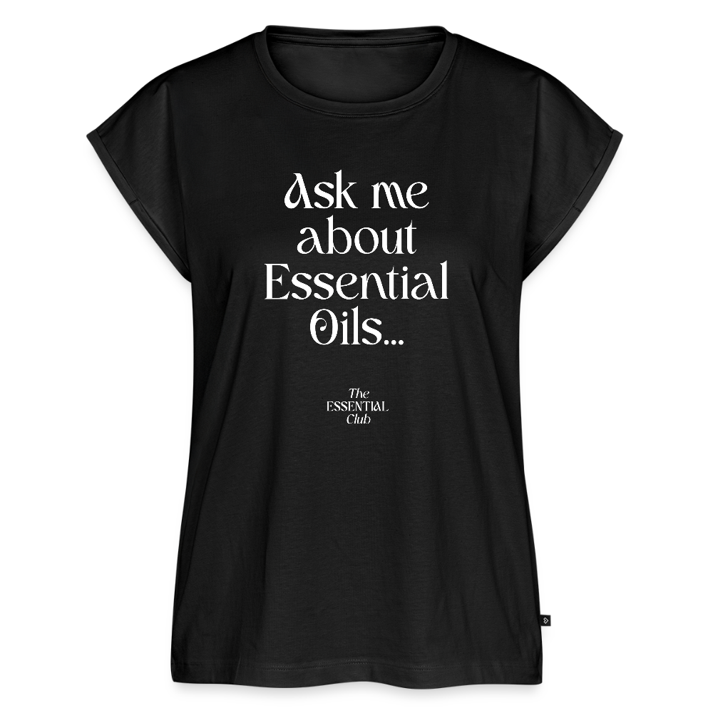 Frauen T-Shirt "Ask me about Essential Oils" mit gerollten Ärmeln - Schwarz