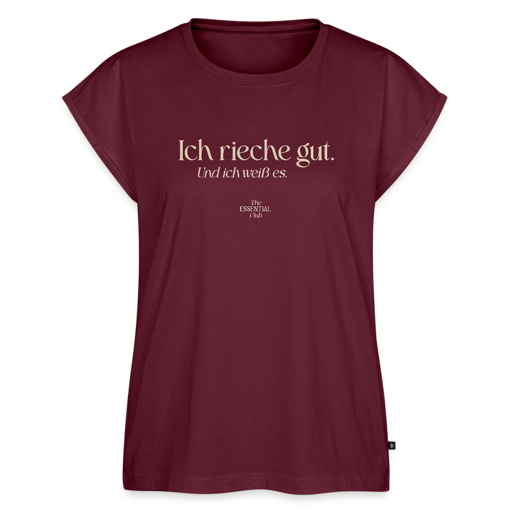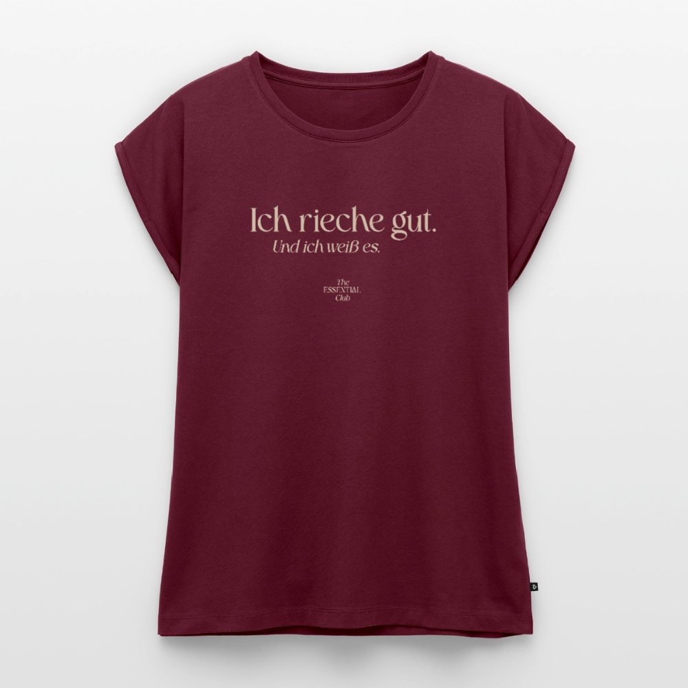 Frauen T-Shirt "Ich rieche gut." mit gerollten Ärmeln - Burgunderrot