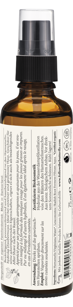 Inhaltsstoffe: HAMAMELIS VIRGINIANA WATER*, LEUCONOSTOC/RADISH ROOT FERMENT FILTRATE, AQUA. *certified organic